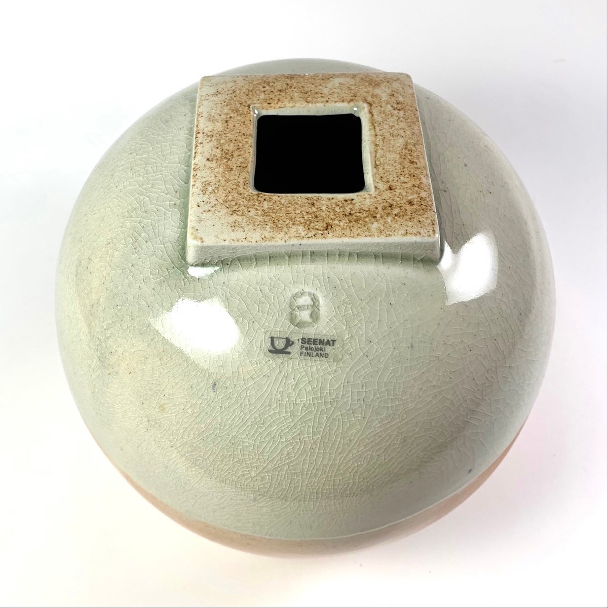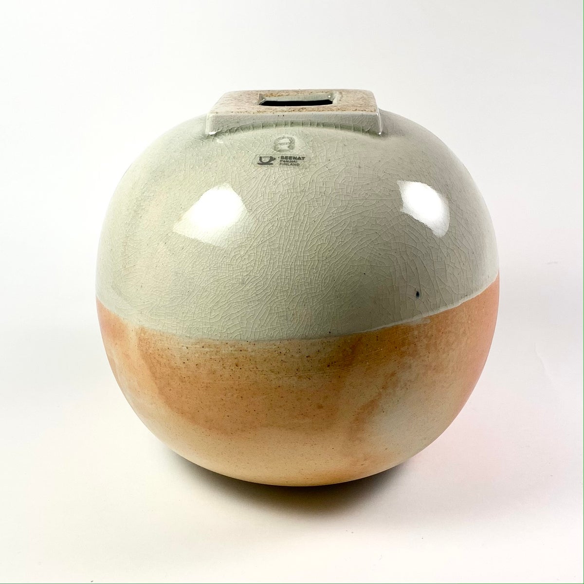 Glazed stoneware ceramicsManufactured by Seenat, Palojoki Finland 1976-2015Fired in a wood-fired kilnSize ø22 h20 cmVase weight 1.7 kgWooden box weight 1.2 kgDishwasher safeMicrowave safe