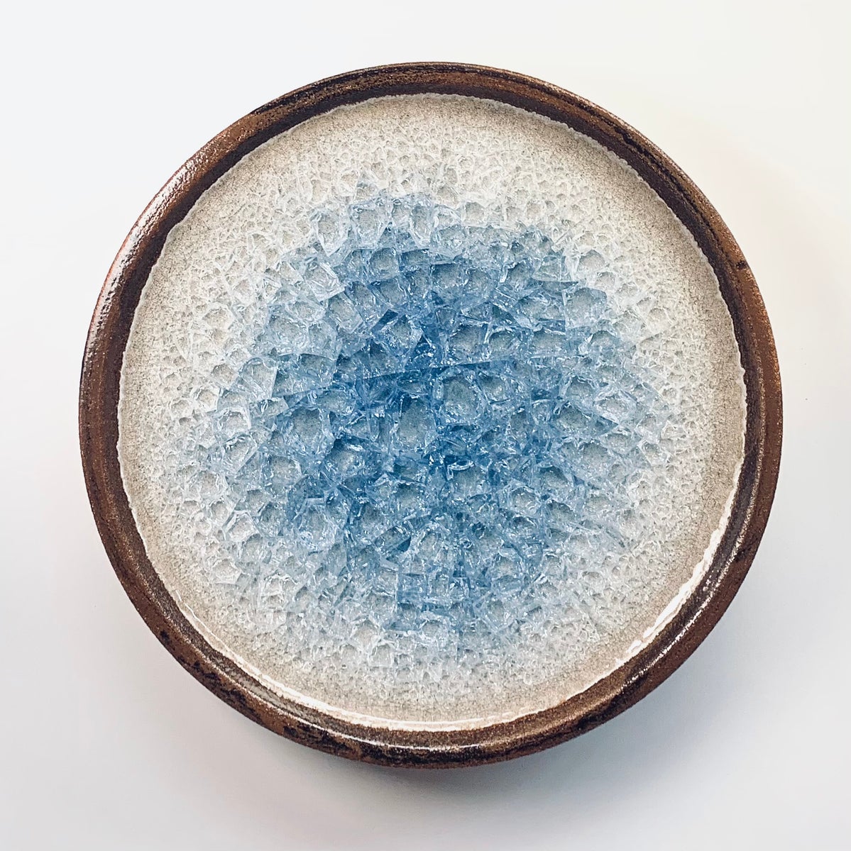 Size ø43.5 x 7 cmWeight 10.7 kgHandmade ceramic and fused colored glass shardsCan be hung on the wallA wide head screw or L-hook is recommended for hanging